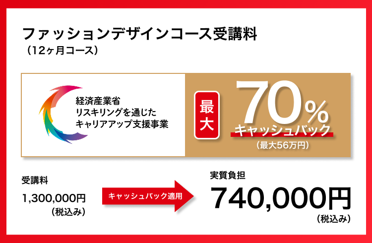 - 本講座は経済産業省リスキリングを通じたキャリアアップ支援事業に採択決定されました。年間受講料の最大70%(一定の条件を満たした場合、年間上限56万円)のキャッシュバックが受けられます。